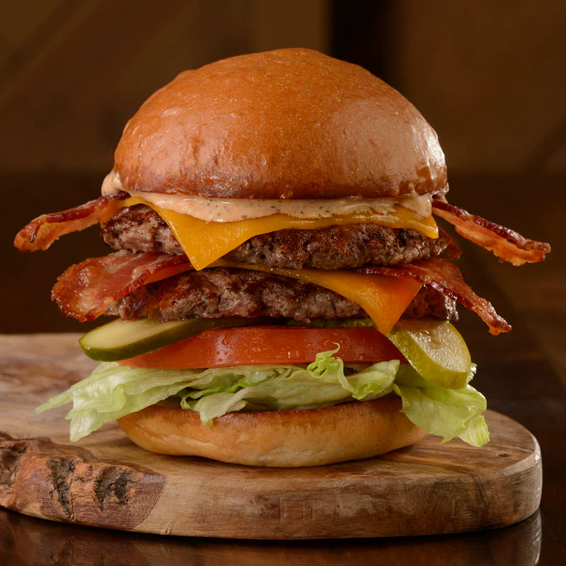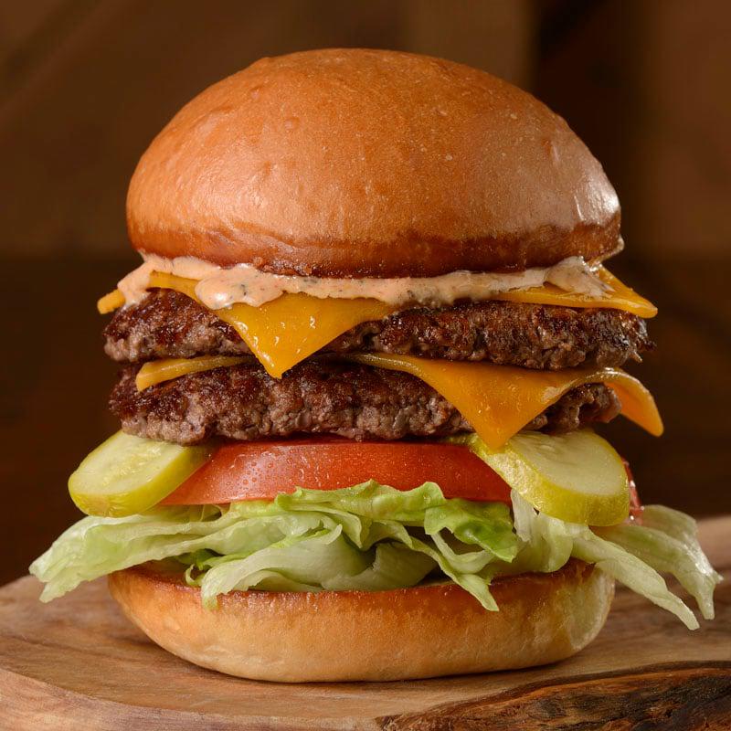 Two-pressed Signature-blend Patties topped with Cheddar, 1921 Sauce, Lettuce, Tomato, and Pickle