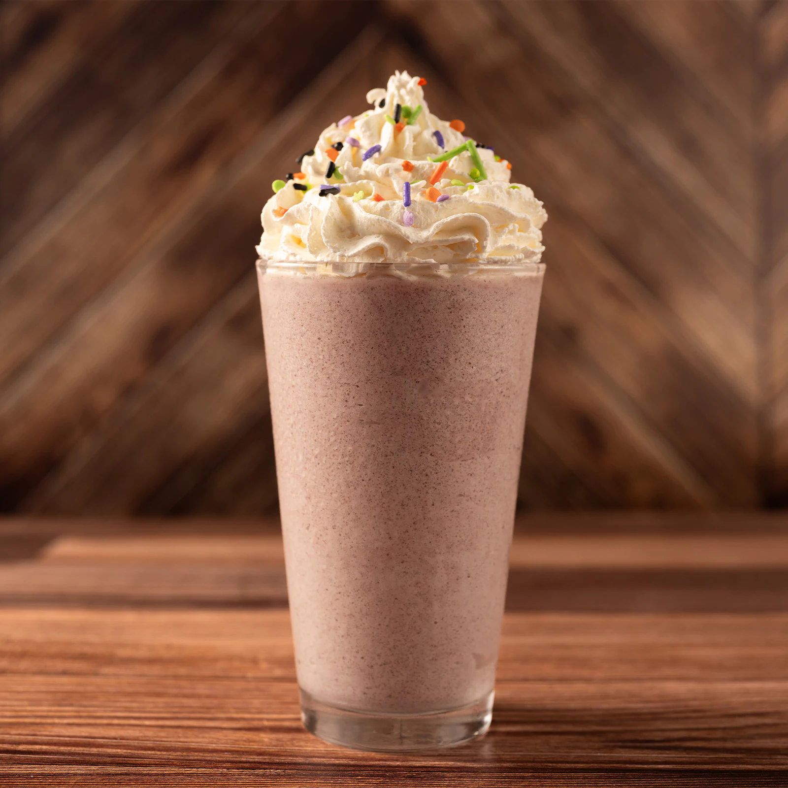 Vanilla Gelato blended with Black Cherry Purée and Chocolate Cookie Pieces topped with Whipped Cream and Sprinkles