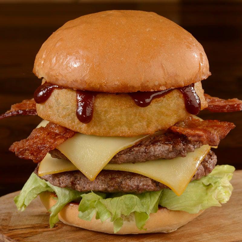 Two pressed Signature-blend Patties topped with a Fried Onion Ring, Muenster, Bacon, Lettuce, and Barbecue Sauce