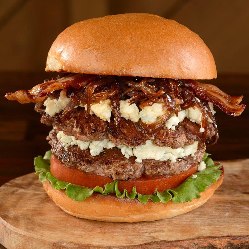 Two-pressed Signature-blend Patties with Bacon, Onion Jam, Blue Cheese, Lettuce, and Tomato
