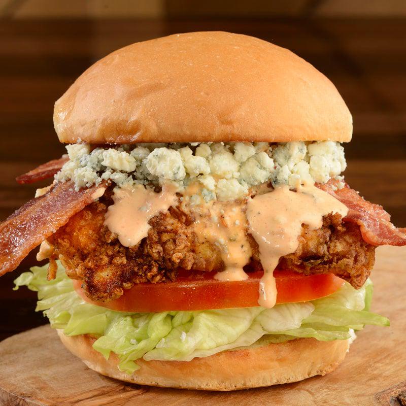 Fried Chicken Breast topped with Bacon, Lettuce, Tomato, Blue Cheese Crumbles, and Buffalo-Ranch Sauce