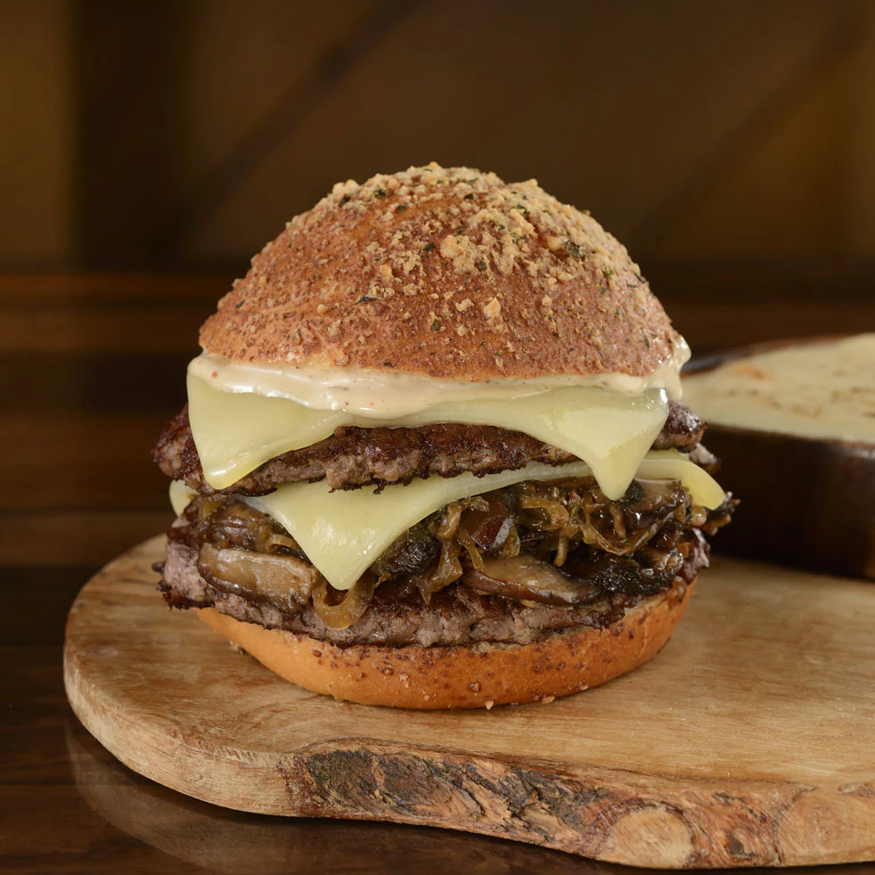 Two-pressed Signature-blend Patties topped with French Onion Ragu, Gruyère-French Onion Dip, and Truffle Aïoli on an Herb-Parmesan Park House Roll