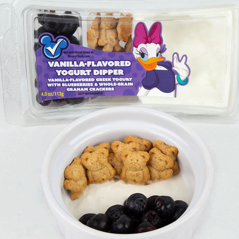 Vanilla-flavored Greek Yogurt with Blueberries and Whole-Grain Graham Crackers with choice of Small Lowfat Milk or Small DASANI® Bottled Water. Meets Disney Nutrition Guidelines for Complete Meals without substitutions