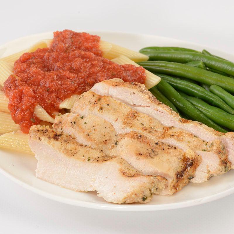 Chicken with Pasta and Marinara served with Green Beans and choice of Small Lowfat Milk or Small DASANI® Bottled Water. Meets Disney Nutrition Guidelines for Complete Meals without substitutions