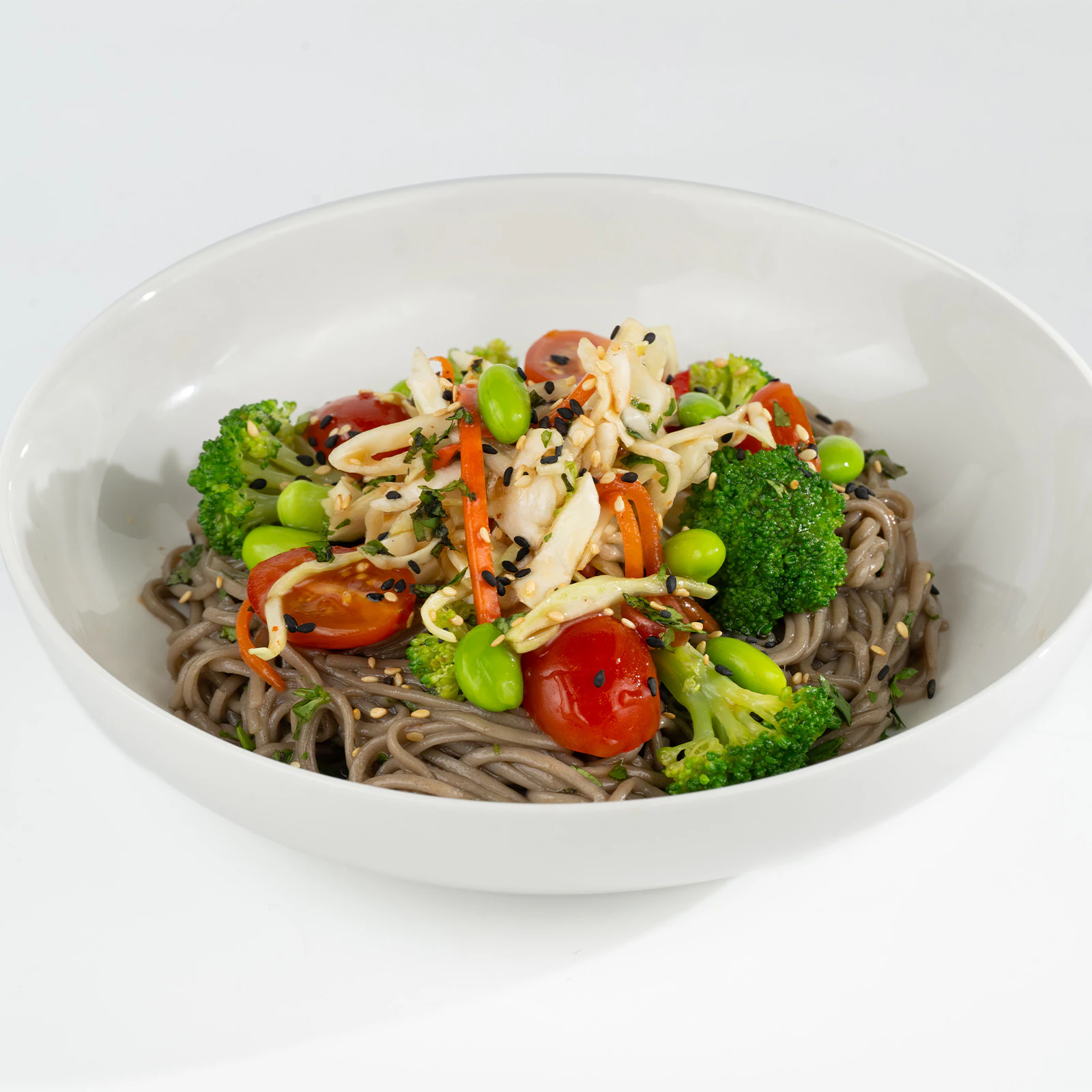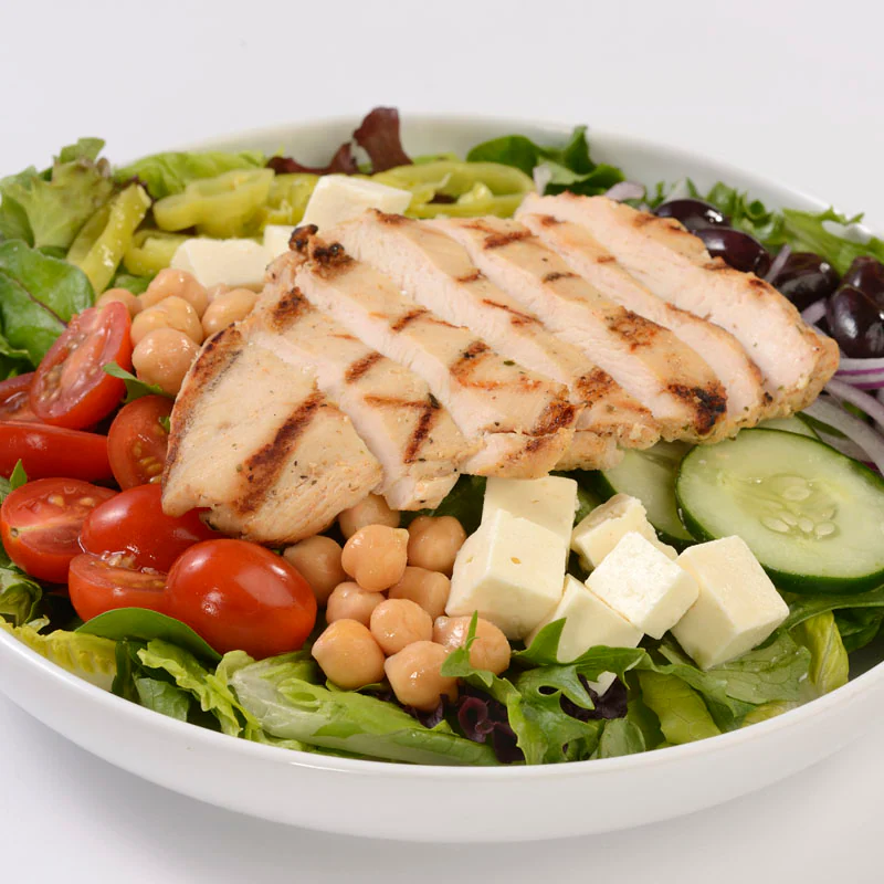 Chilled Chicken Breast over Crispy Greens topped with Tomatoes, Cucumbers, Red Onion, Chickpeas, Olives, Feta, and Peppers finished with Vinaigrette Dressing