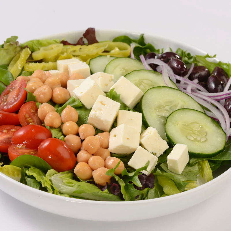 Crispy Greens topped with Tomatoes, Cucumbers, Red Onion, Chickpeas, Olives, Feta, and Peppers finished with Vinaigrette Dressing