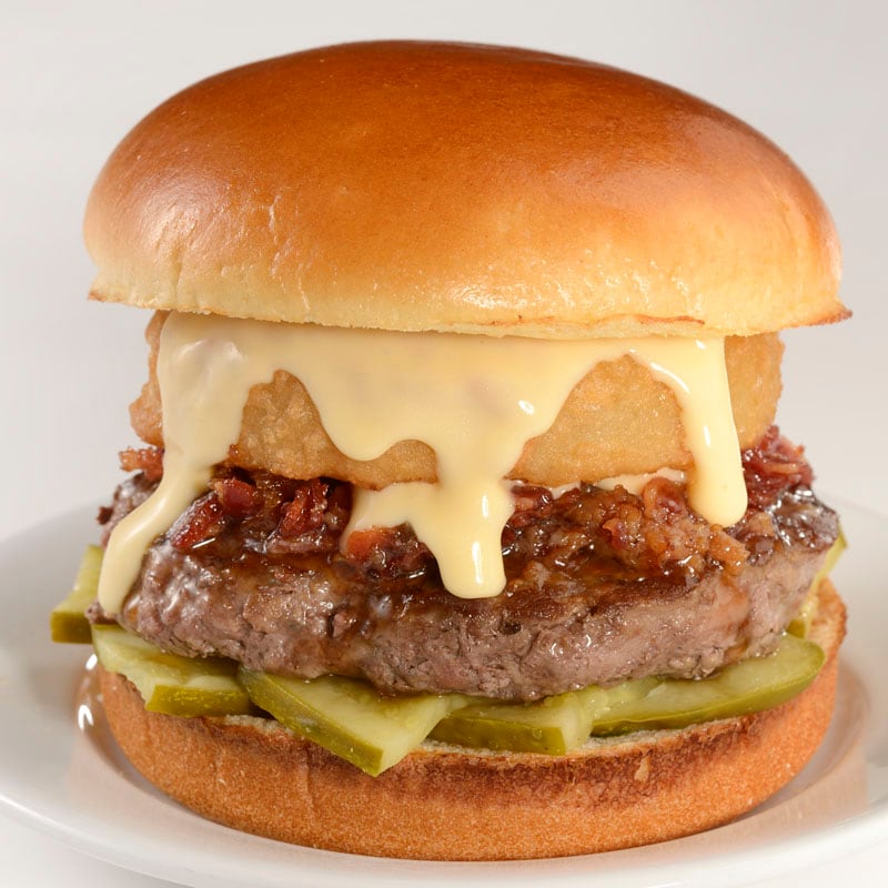 Bacon Jam, Onion Ring, and Beer-Cheese Sauce served with French Fries