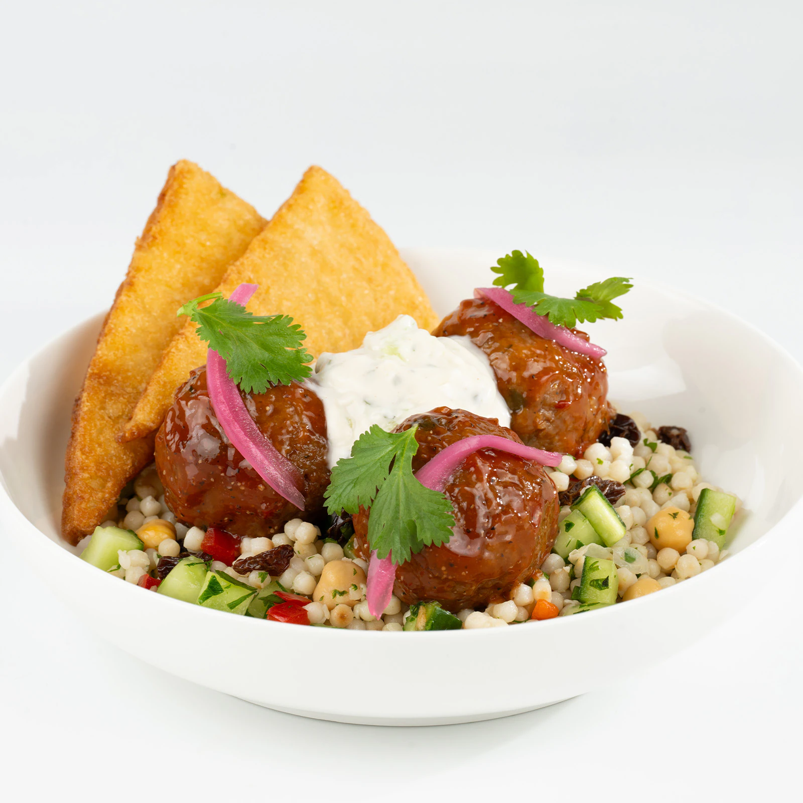 Harissa-spiced Impossible® Meatballs, Couscous Salad, Tzatziki Sauce, Pickled Onions, and Cauliflower Pita Crisps