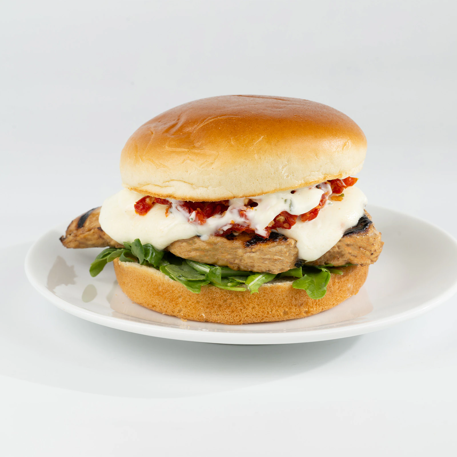 with Mozzarella, Sun-dried Tomato Aïoli, and Arugula on a Brioche Bun