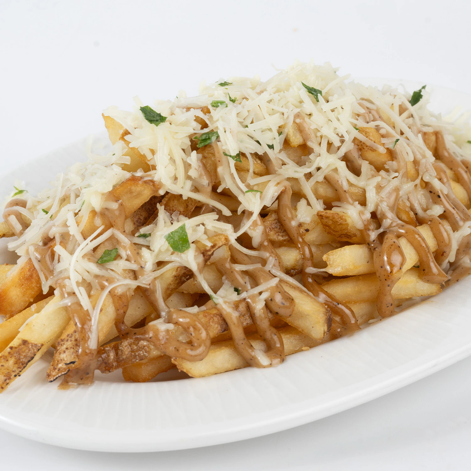 French Fries topped with Black Garlic-Truffle Aïoli and Parmesan