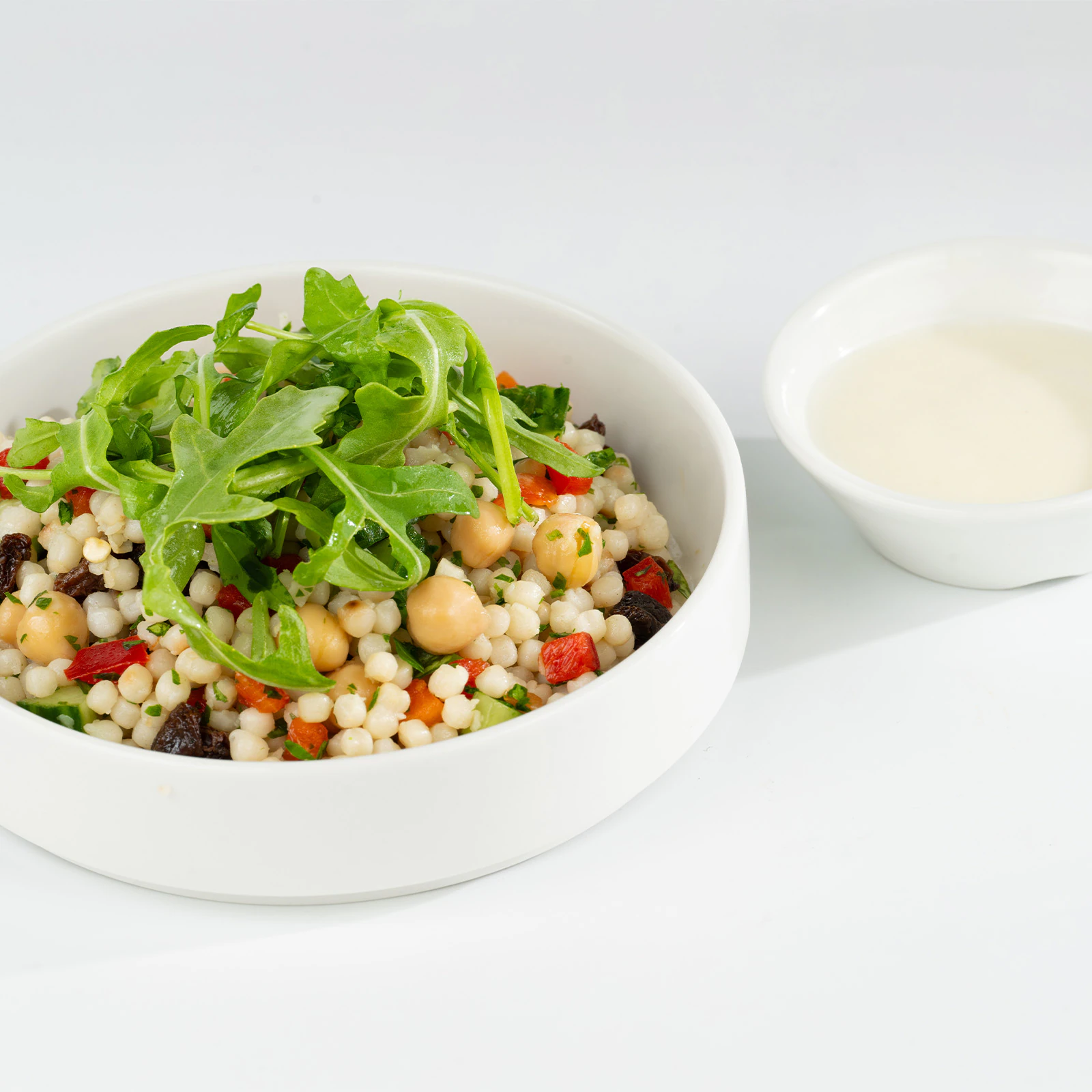 Couscous, Cucumbers, Raisins, Red Peppers, Chickpeas, Fresh Herbs, and Arugula served with a Lemon Vinaigrette