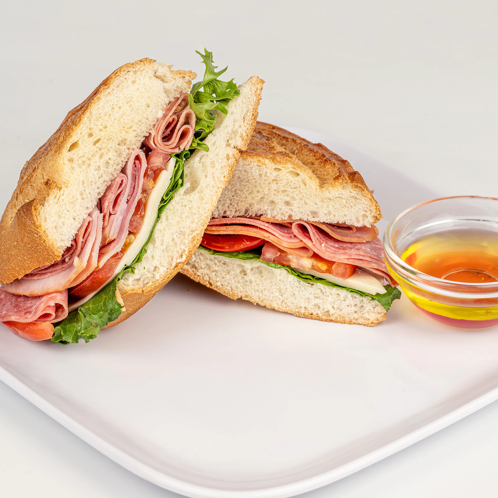 Ham, Salami, Lettuce, Provolone, and Tomato on a Roll with Oil and Vinegar