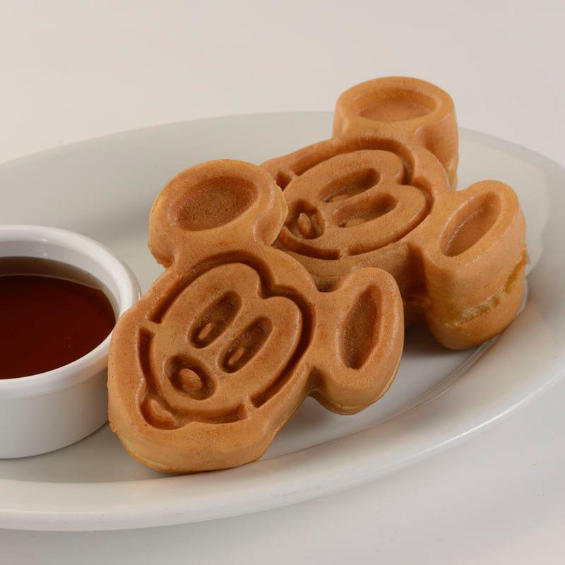 Mickey-shaped Waffle, Scrambled Eggs, and Potato Barrels served with Bacon and Sausage