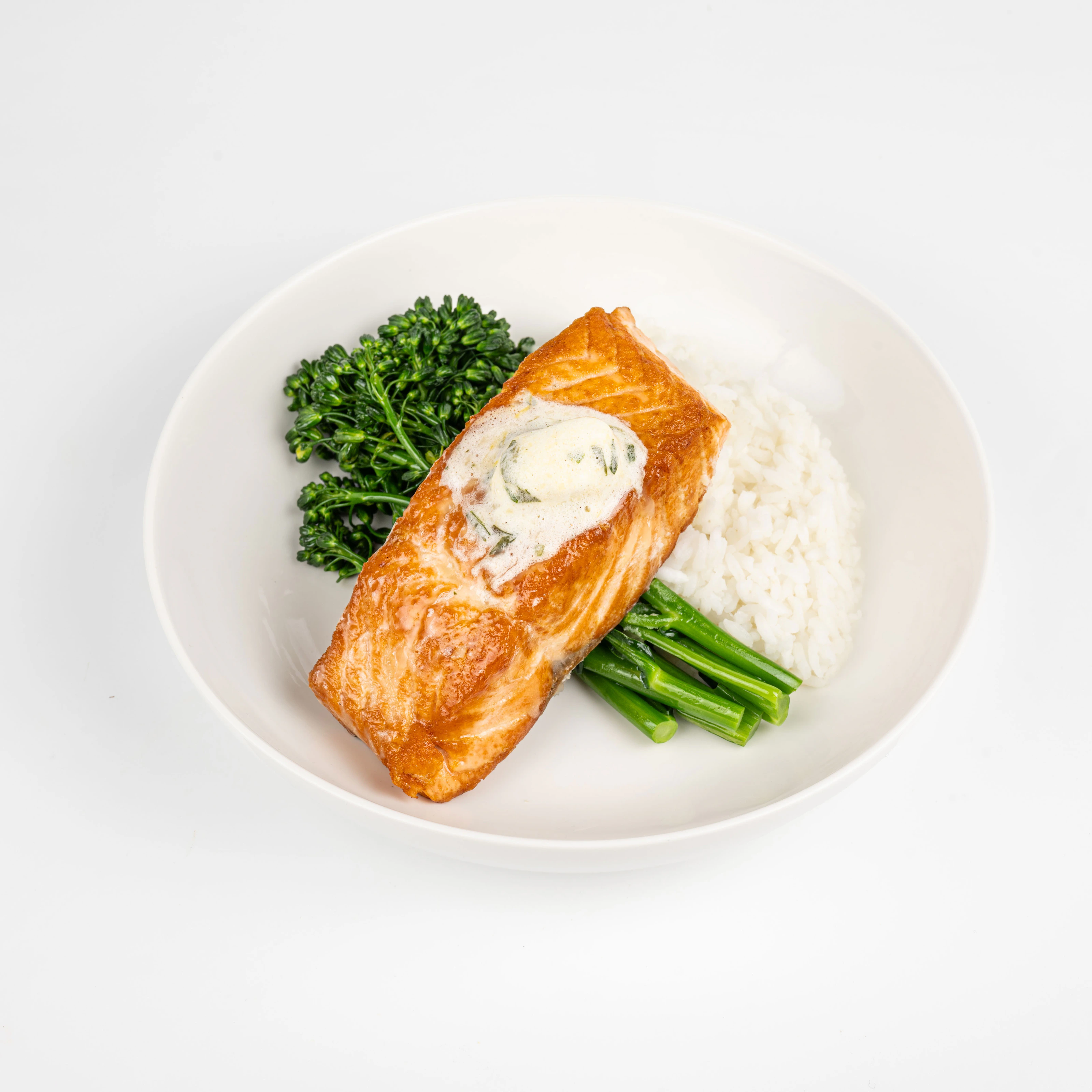 Salmon with Citrus-Basil Butter, Seasonal Vegetable, and Steamed Rice