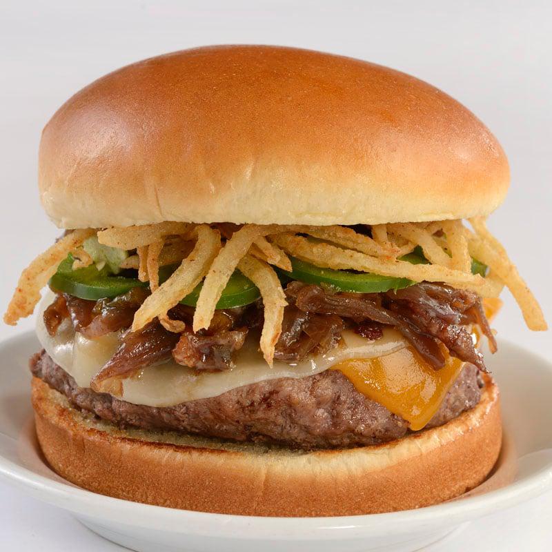 with Bacon-Onion Jam, Cheddar, Provolone, Jalapeño, and Crispy Onions on a Toasted Brioche Bun served with French Fries