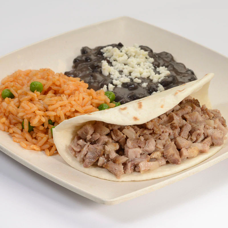 Pork Carnitas on a Flour Tortilla served with Mexican Rice and Black Beans with Pork and Queso Fresco and choice of Small Lowfat Milk or Small DASANI® Bottled Water