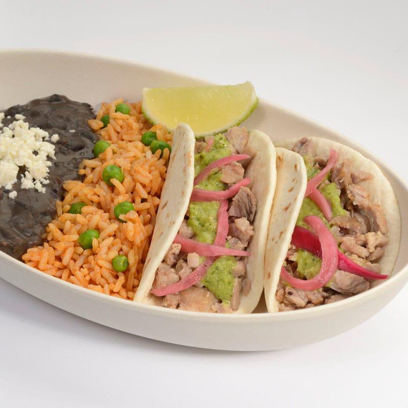 Pork Carnitas on Flour Tortillas topped with Avocado Salsa Verde and Pickled Onions served with Mexican Rice and Pork Black Beans