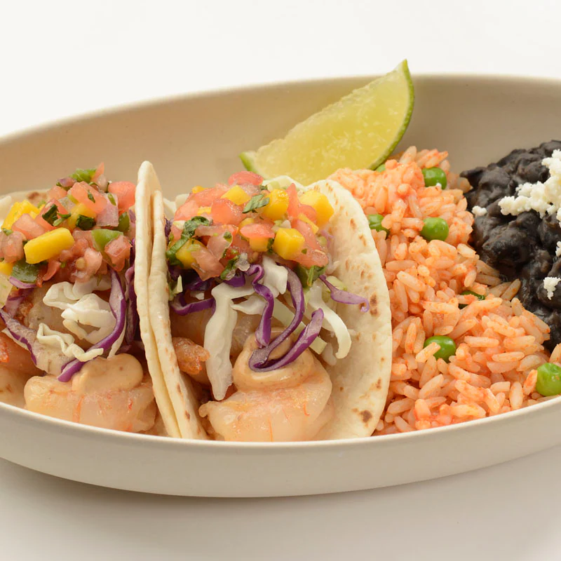 Sautéed Shrimp on Flour Tortillas topped with Cabbage Slaw, Chipotle Mayonnaise, and Mango Salsa served with Mexican Rice and Pork Black Beans topped with Queso Fresco