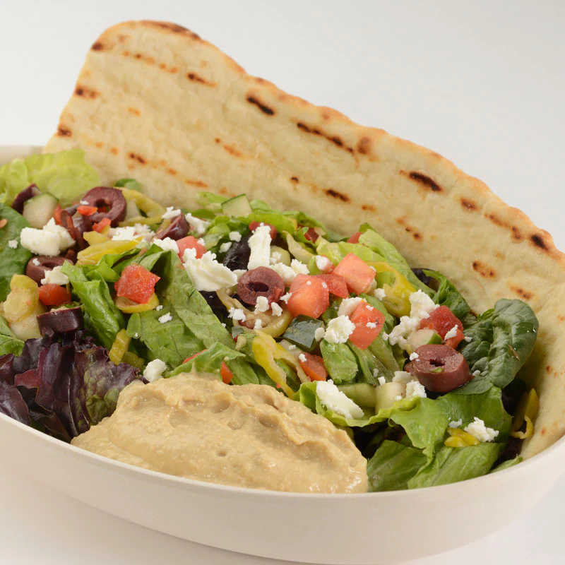 Mixed Greens with Tomatoes, Cucumber, Pepperoncini, Kalamata Olives, and Feta tossed in Mediterranean Vinaigrette served with Hummus and Grilled Flatbread