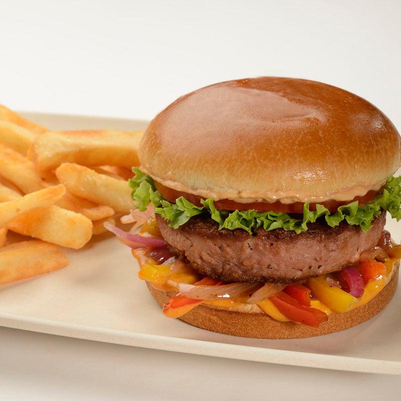 Seared Farm Fresh Plant-based Burger with Sriracha Mustard and Balsamic-glazed Grilled Peppers and Onions with a "Mayonnaise"-Ketchup blend, Lettuce, and Tomato on Allergy-Friendly Bun served with choice of Side
