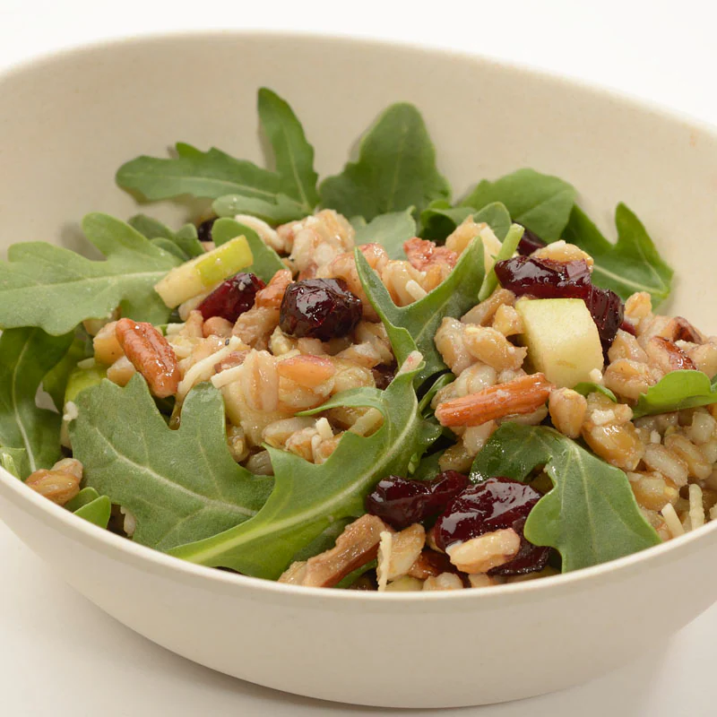 Arugula, Farro, Granny Smith Apples, Dried Cranberries, Plant-based Parmesan, and Pecans tossed in a Dijon Vinaigrette