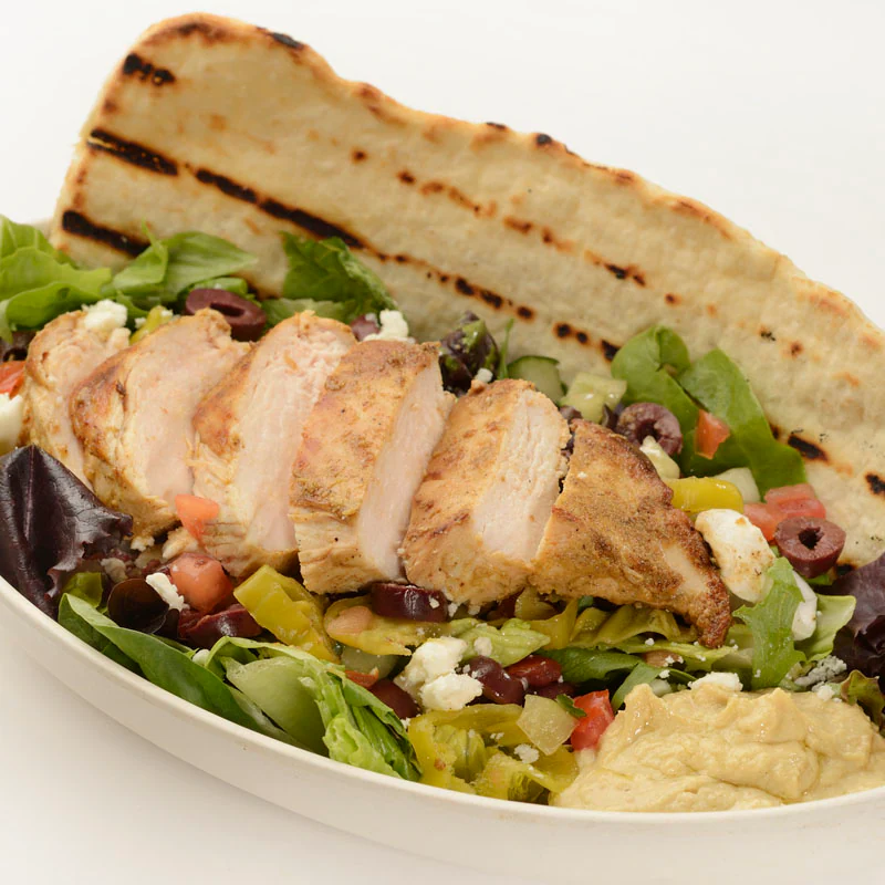 Marinated Chicken served over Mixed Greens with Tomatoes, Cucumber, Pepperoncini, Kalamata Olives, and Feta tossed in a Mediterranean Vinaigrette served with Hummus and Grilled Flatbread