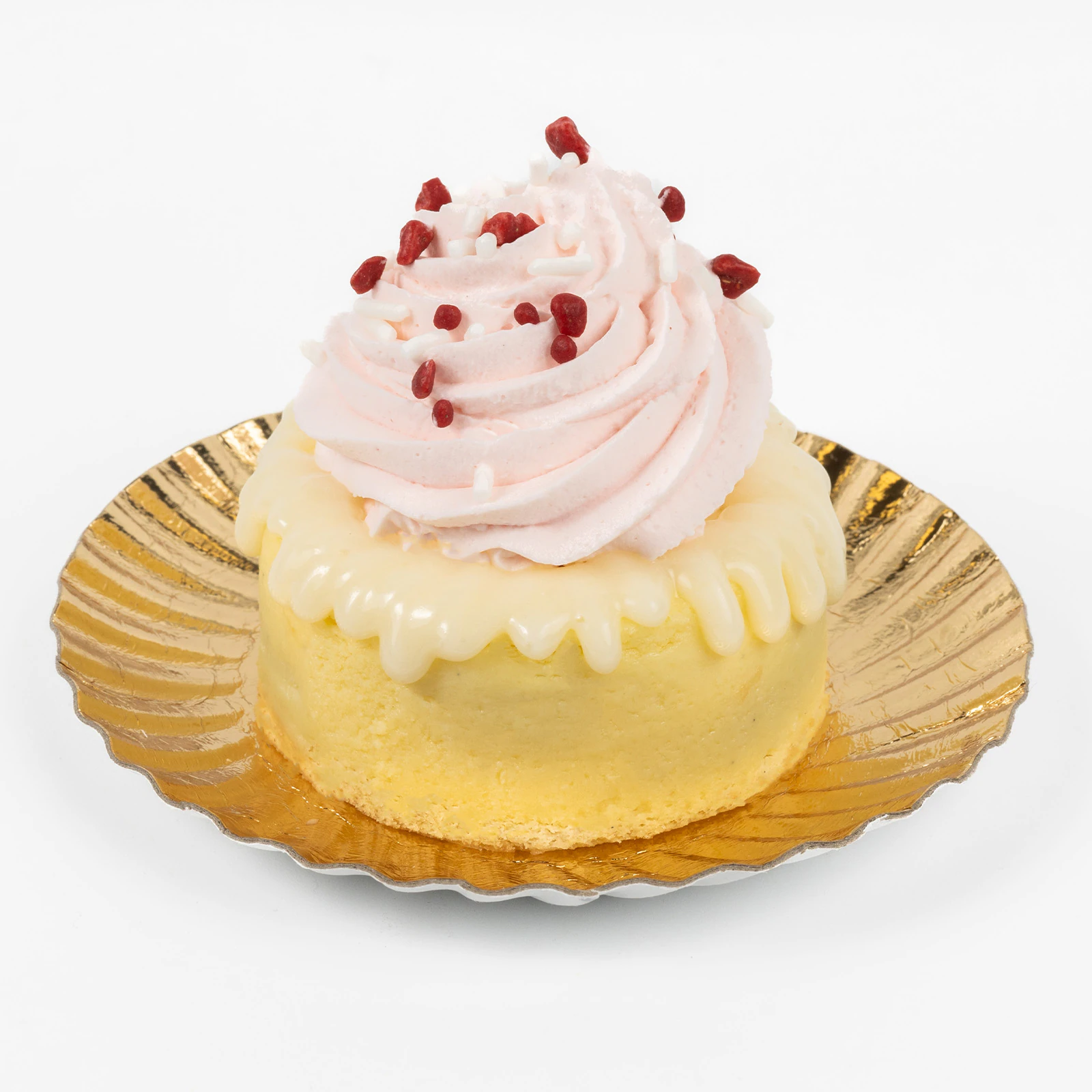 Lemon Cheesecake with White Chocolate Ganache Drip, Strawberry Whipped Cream, and topped with Freeze-dried Strawberries and White Sprinkles