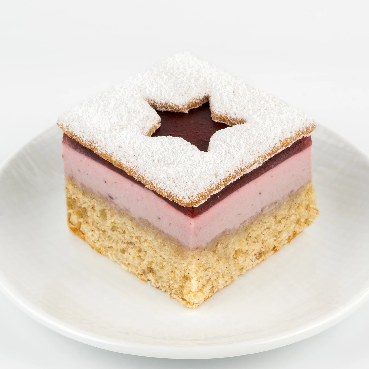 Layers of Hazelnut Cake, Raspberry-Blackcurrant Mousse, Raspberry Jam, and Sweet Snow-dusted Linzer Cookie