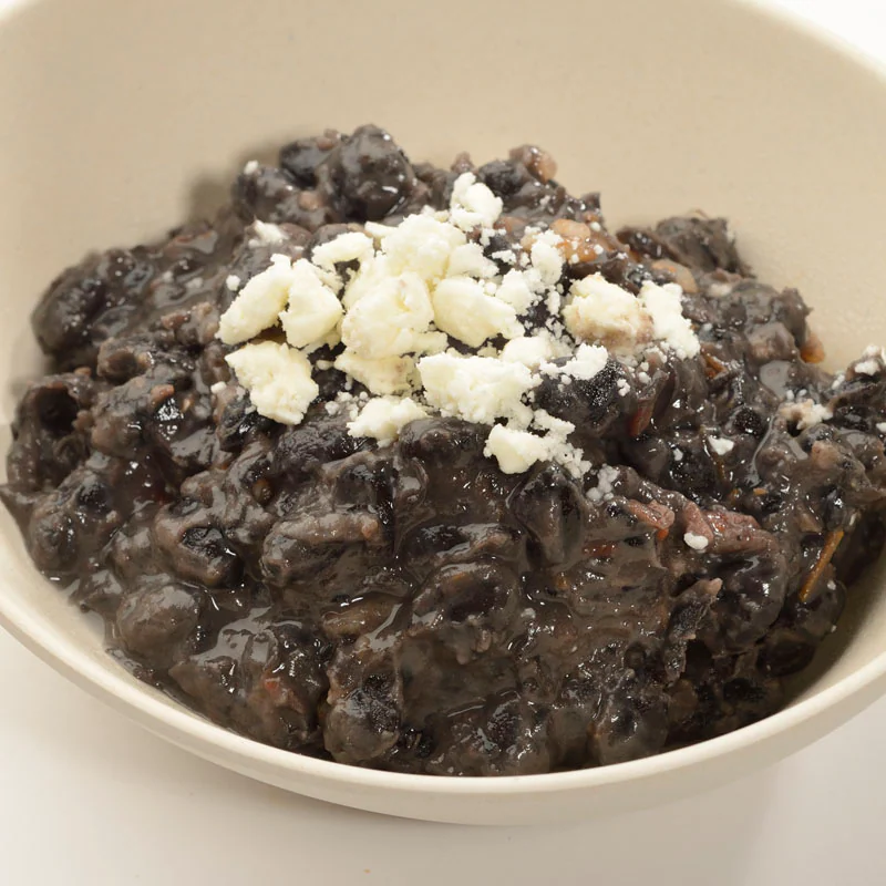 Pork Carnitas on Flour Tortillas topped with Avocado Salsa Verde and Pickled Onions served with Mexican Rice and Pork Black Beans topped with Queso Fresco