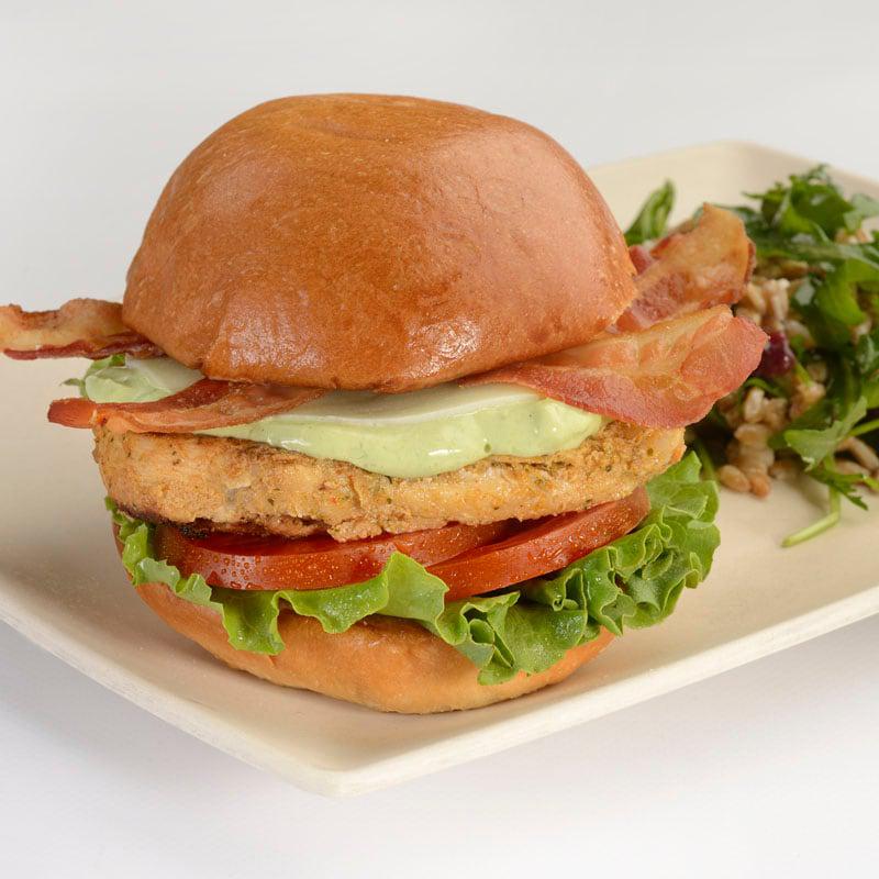 Marinated Chicken with Bacon, Provolone, Avocado Ranch, Lettuce, and Tomato served on an Allergy-Friendly Bun served with choice of Side