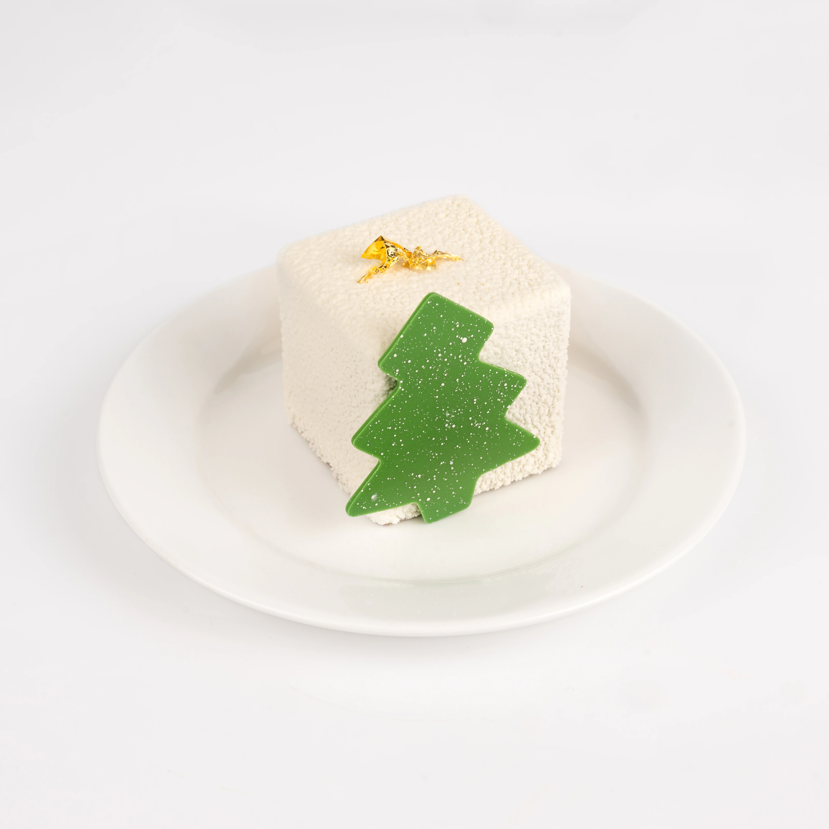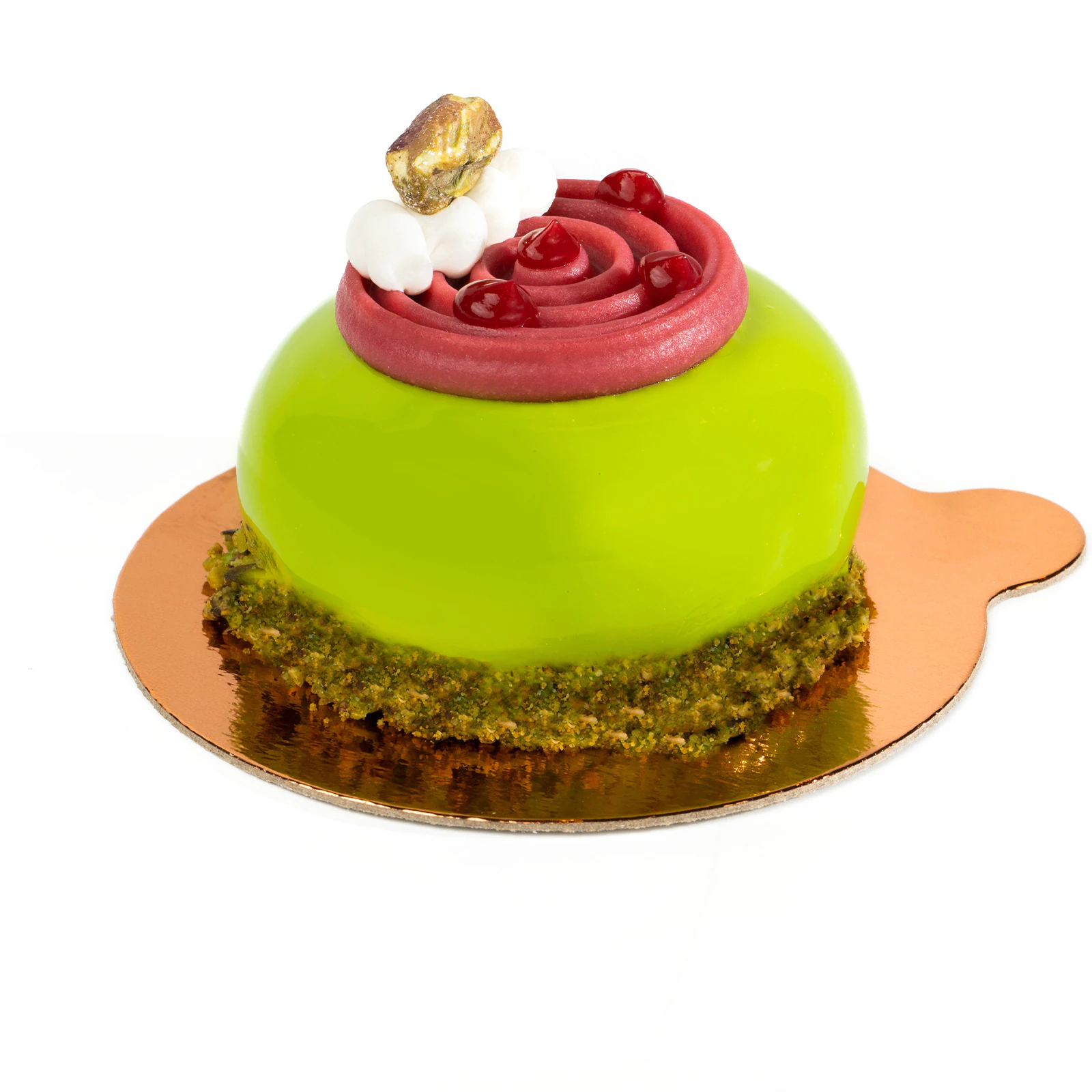 Pistachio Mousse filled with Raspberry Gelée and Pistachio Sponge Cake topped with Raspberry Crémeux