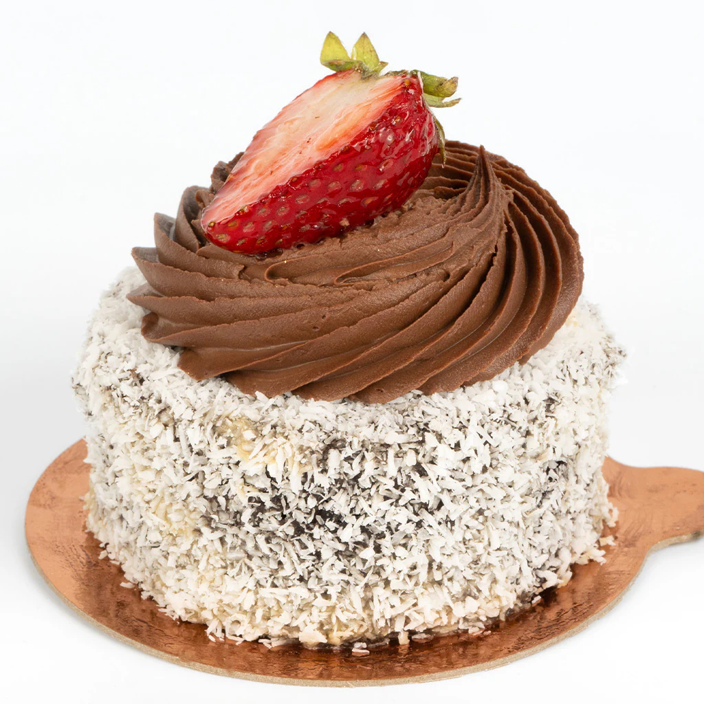 Chocolate Cake soaked with Caramel Syrup, filled with Strawberry Sauce, and topped with Coconut-Chocolate Ganache
