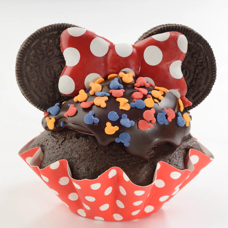 Chocolate Cupcake filled with Cookies 'n Cream Mousse and topped with Ganache Dipped Buttercream, Cookie Ears, and Chocolate Bow