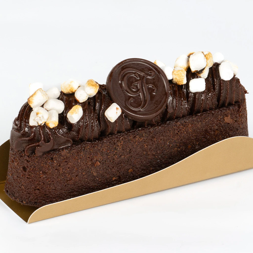 Chocolate Brownie filled with Sugared Pecans and Caramel Sauce topped with Chocolate Ganache and Toasted Marshmallows