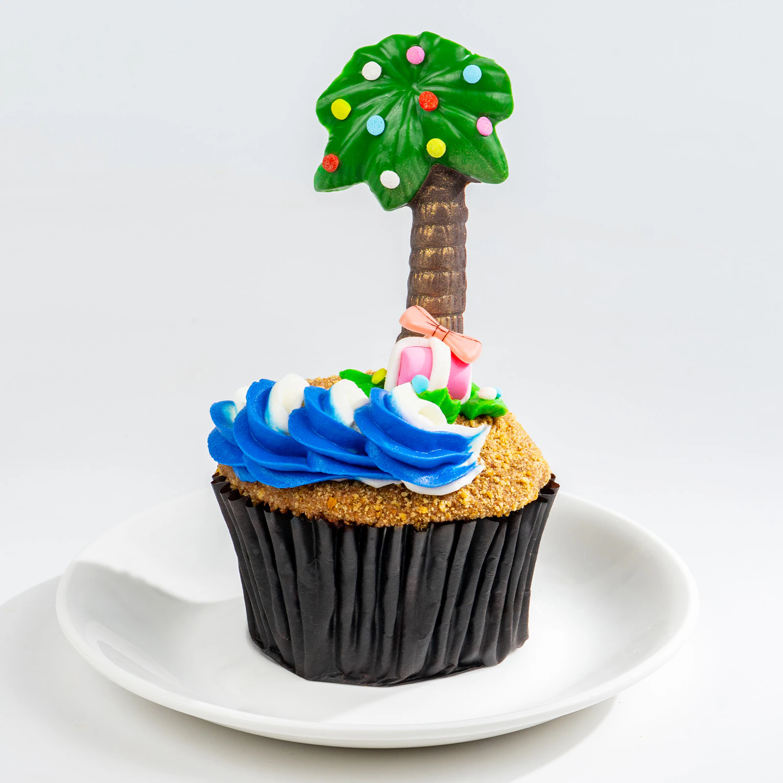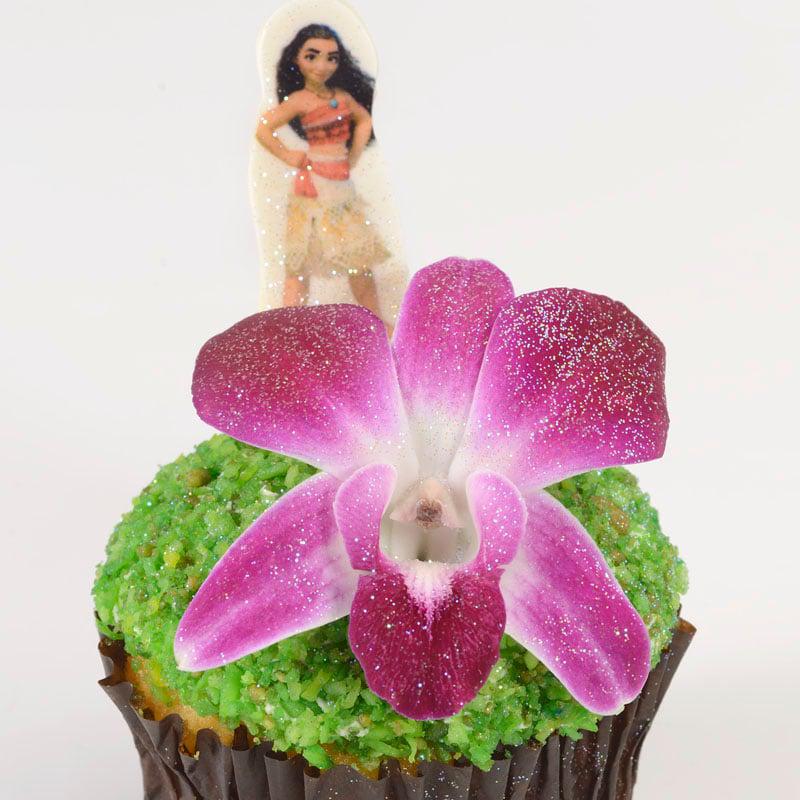 Vanilla Cupcake, Toasted Coconut Mousse Filling, Buttercream, Coconut Flakes, and White Chocolate Moana piece with a fresh Orchid