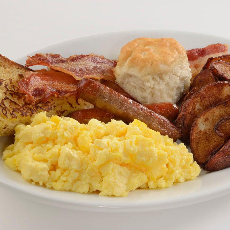 Scrambled Eggs and French Toast served with Bacon, Sausage, Breakfast Potatoes, and a Biscuit