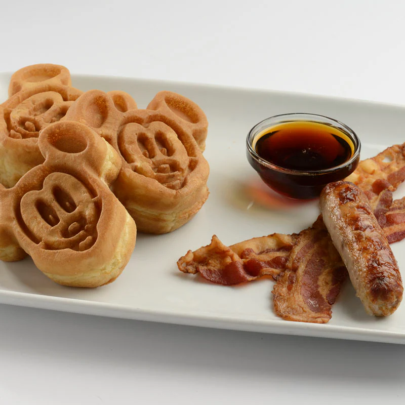 Mickey-shaped Waffle, Scrambled Eggs, Bacon, Sausage, and Breakfast Potatoes