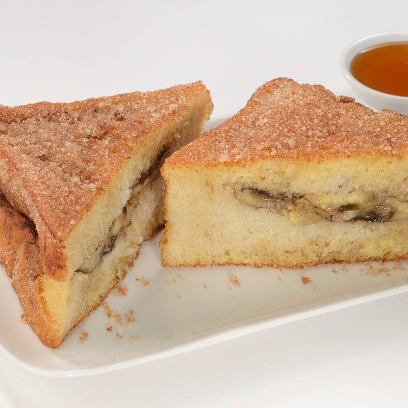 Banana-stuffed Sourdough Bread, Battered, Deep-fried, and Dusted with Cinnamon-Sugar served with Bacon or Sausage