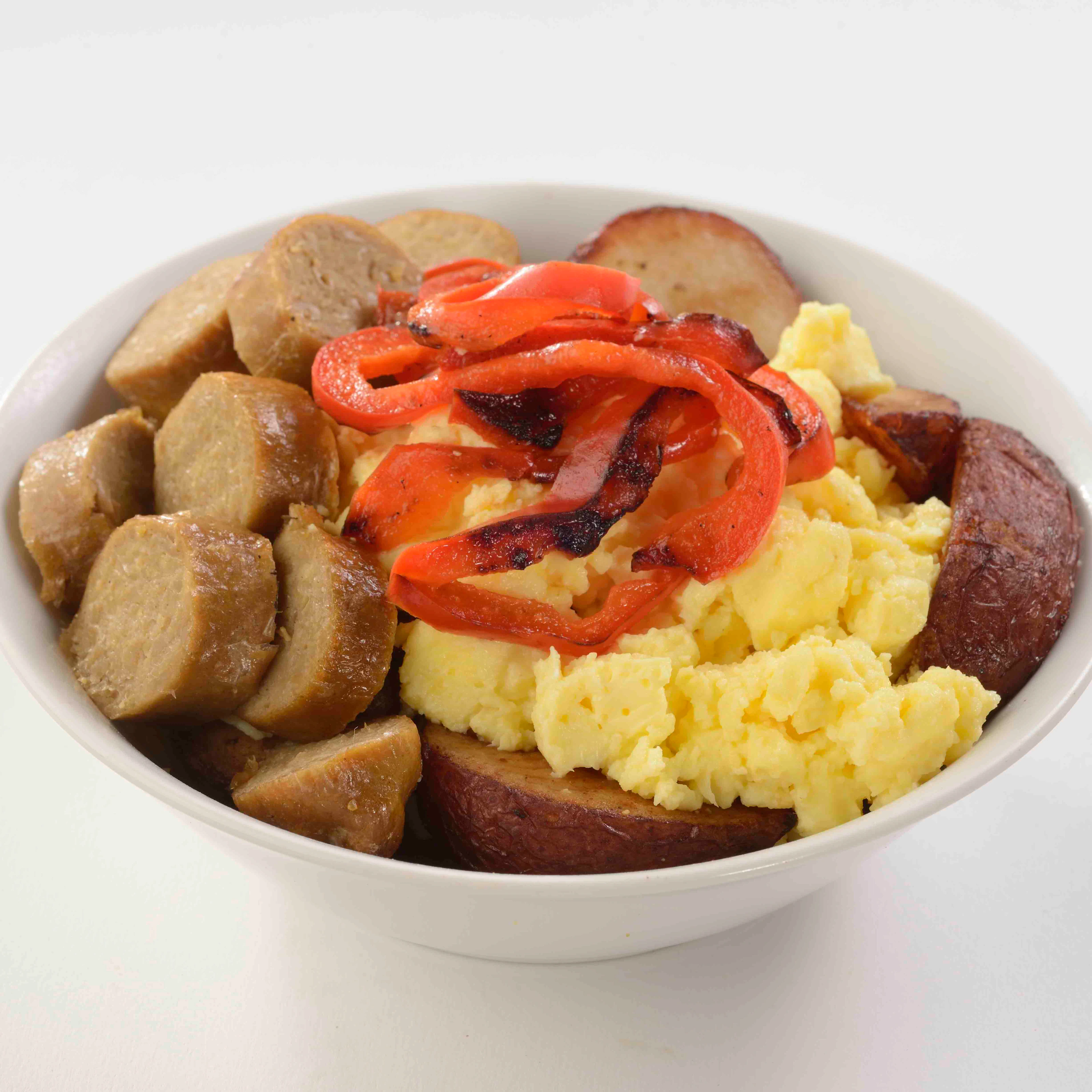 Plant-Based Sausage and Scramble served with Breakfast Potatoes and Red Peppers