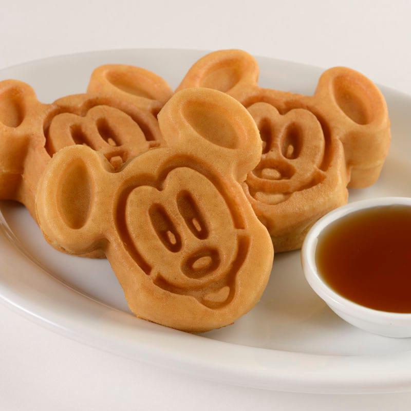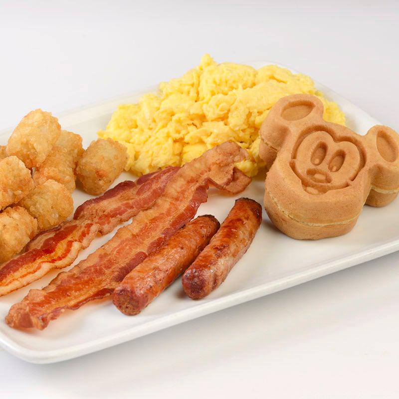 Mickey-shaped Waffle, Scrambled Eggs, and Potato Barrels served with Bacon and Sausage