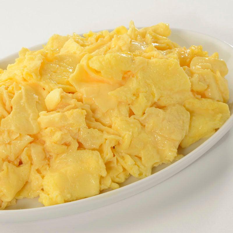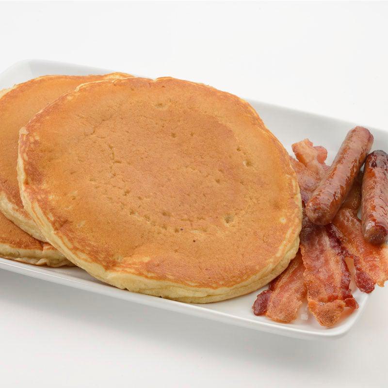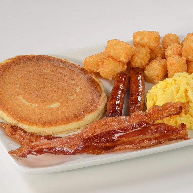 Allergy-Friendly Pancake, Scrambled Eggs, Potato Barrels, Bacon, and Sausage
