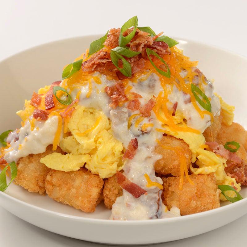 Potato Barrels topped with Scrambled Eggs, Cheddar, Sausage Gravy, and Bacon