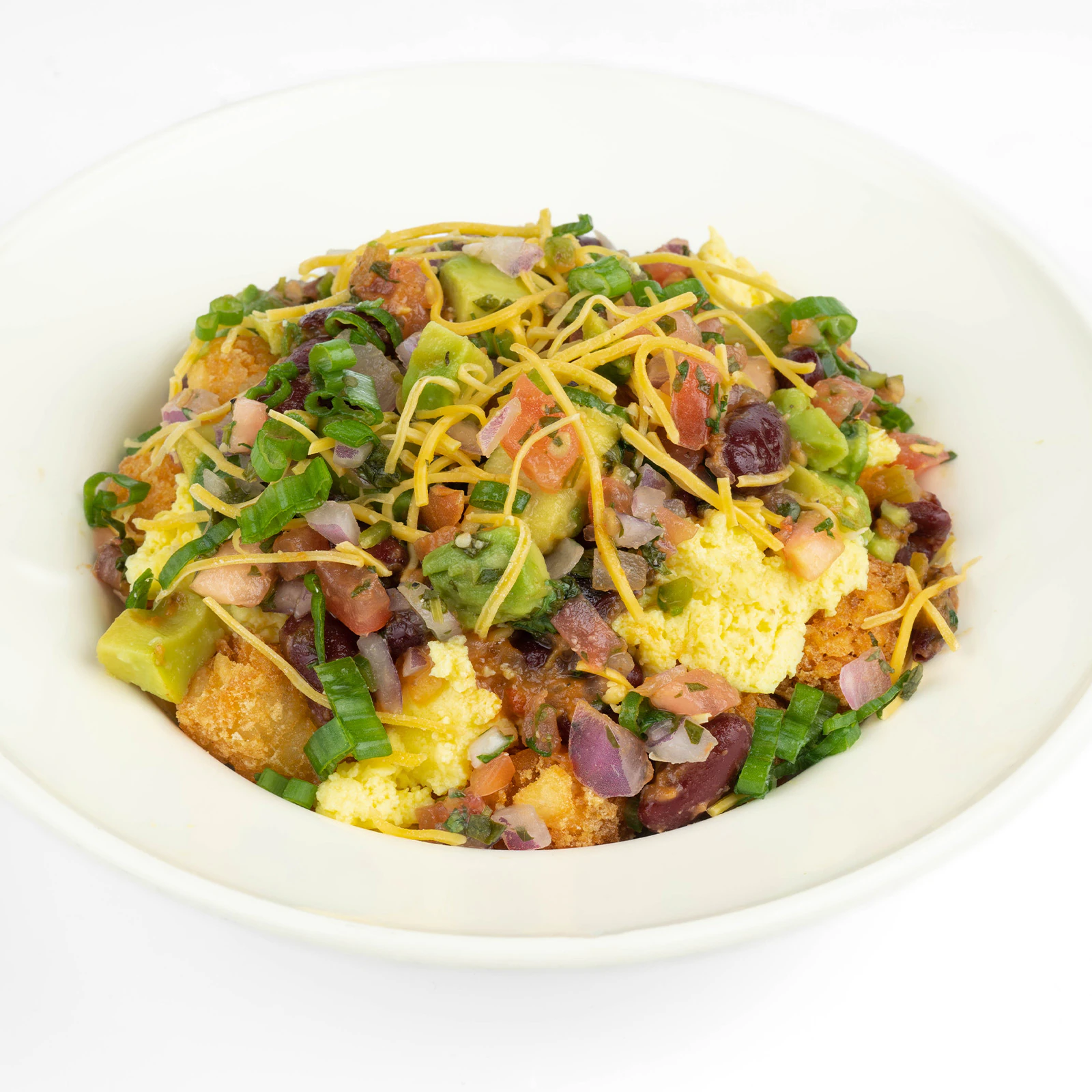 Potato Barrels topped with Scrambled Eggs, Cheddar, Southwest-style Beans, Avocado, and Salsa Fresca