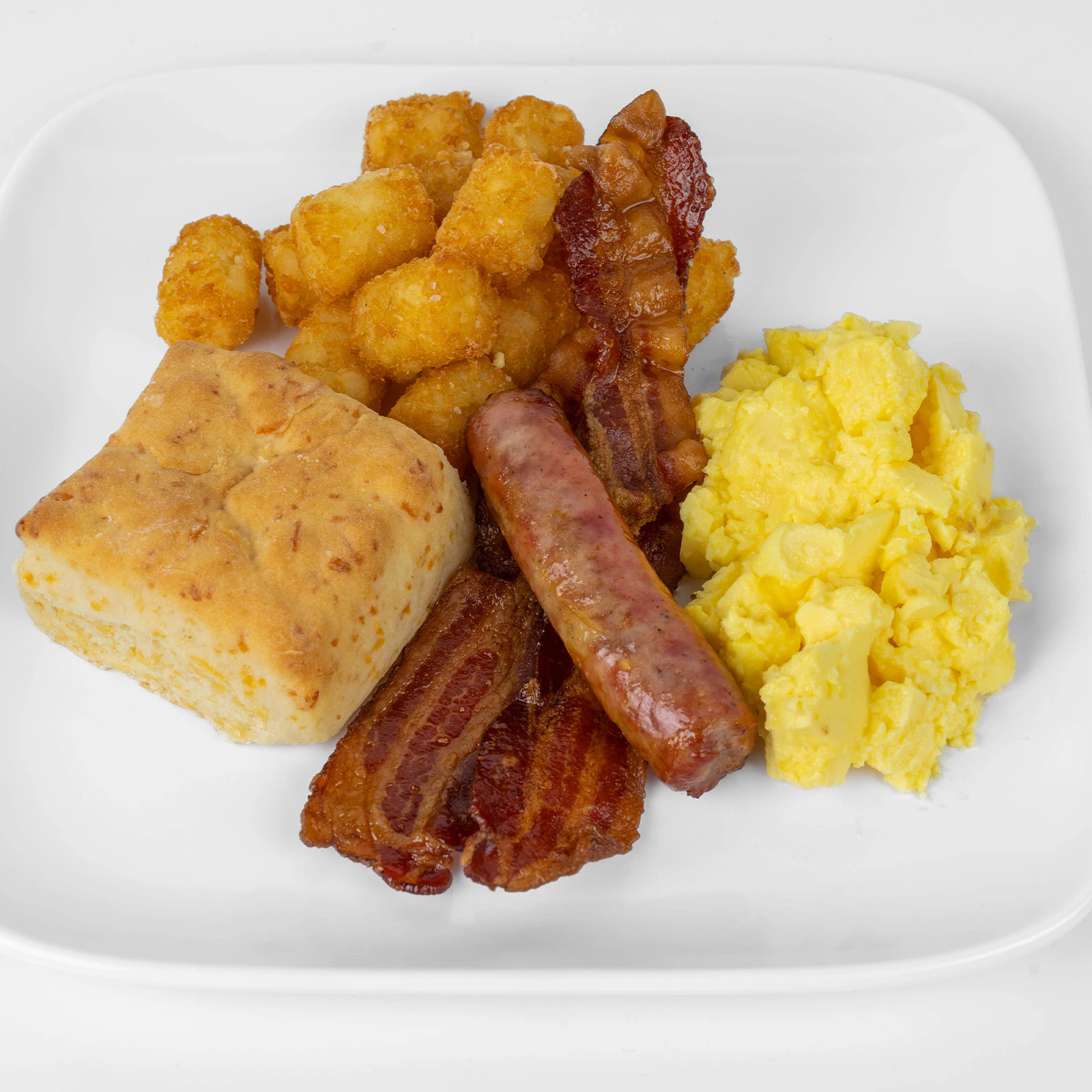 Scrambled Eggs, Potato Barrels, Sausage, Bacon, and a Cheese Biscuit