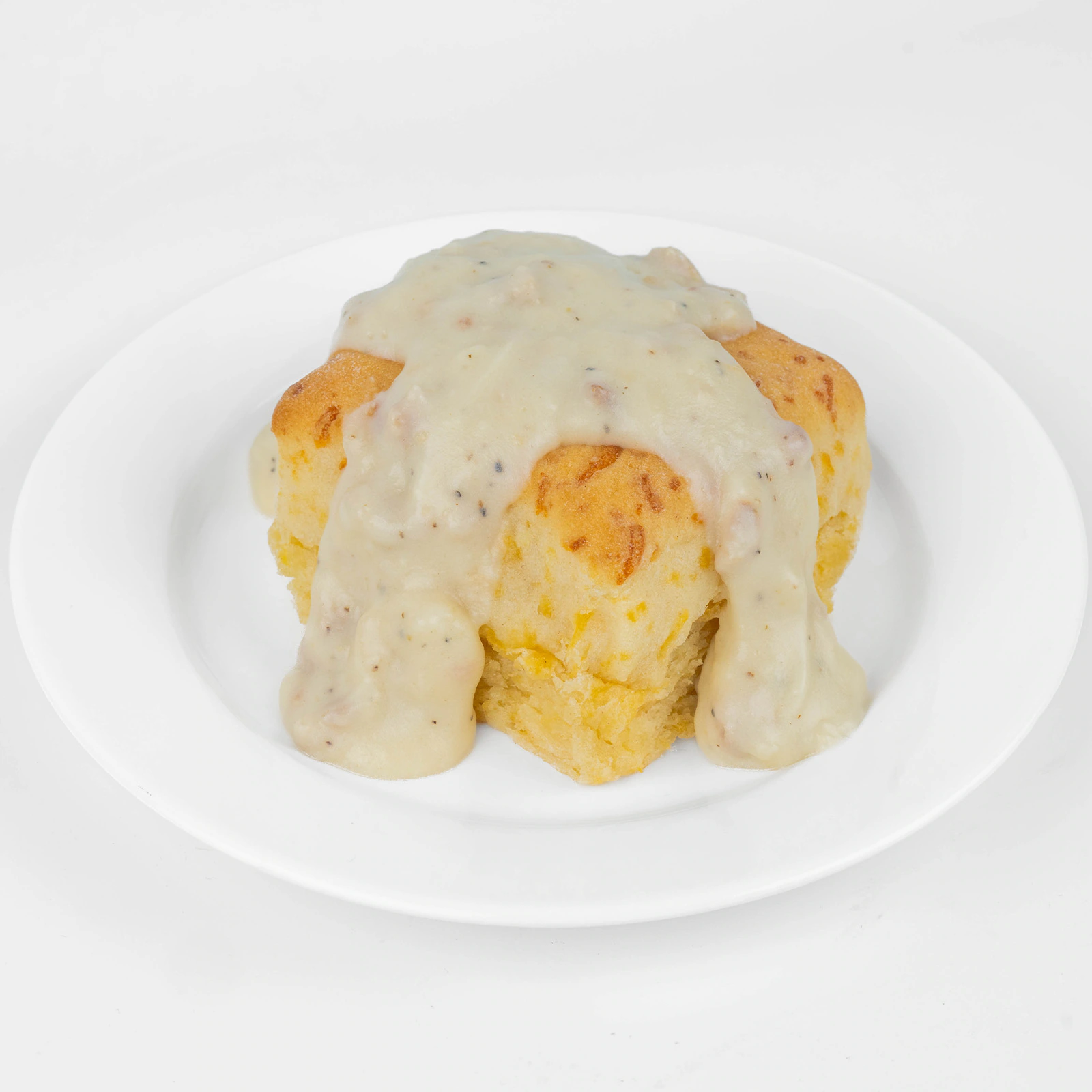 Potato Barrels, Scrambled Eggs, Cheddar, Sausage Gravy, Bacon, and Green Onion
