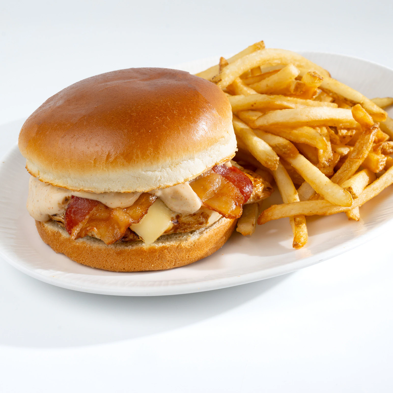 Chicken Breast with Swiss Cheese, Bacon, and Garlic Aїoli on a Brioche Bun served with French Fries