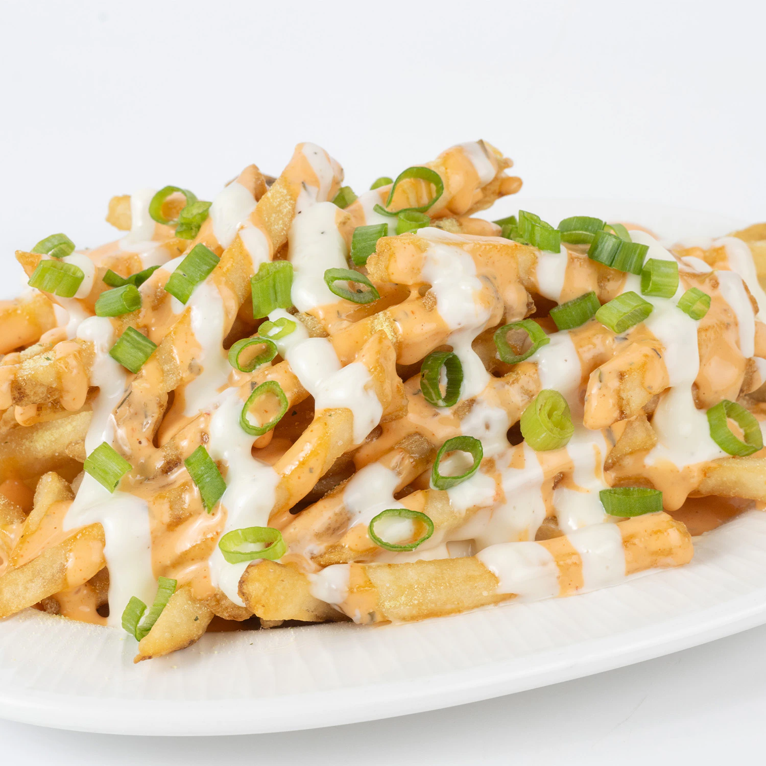 Ranch-seasoned French Fries drizzled with Buffalo-Ranch Sauce and Blue Cheese Dressing
