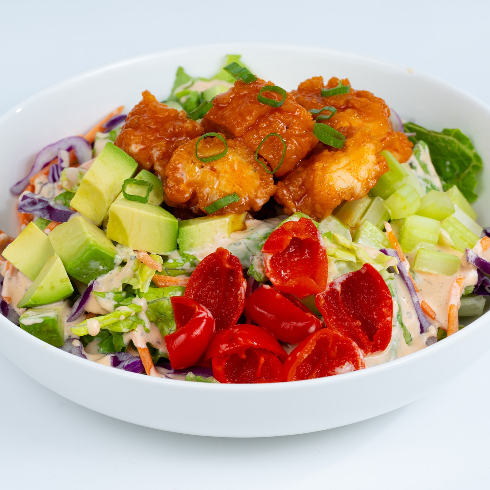 Hot Honey Buffalo Chicken, Romaine Lettuce, Carrots, Red Cabbage, Celery, Cucumber, Avocado, Peppadew Peppers, and Green Onion with Sriracha-Ranch Dressing