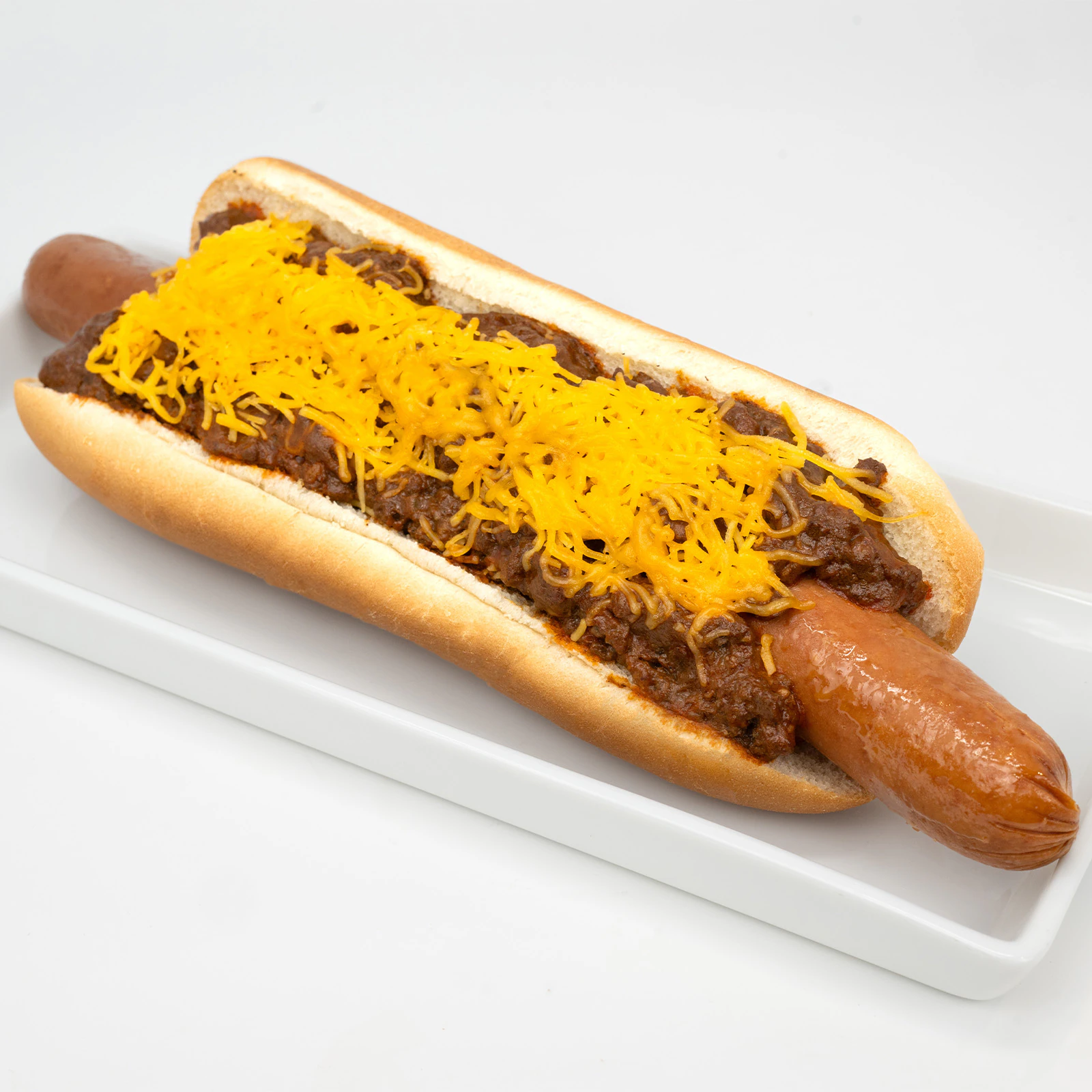 All-Beef Foot-long Hot Dog topped with Chili and Cheese served with French Fries