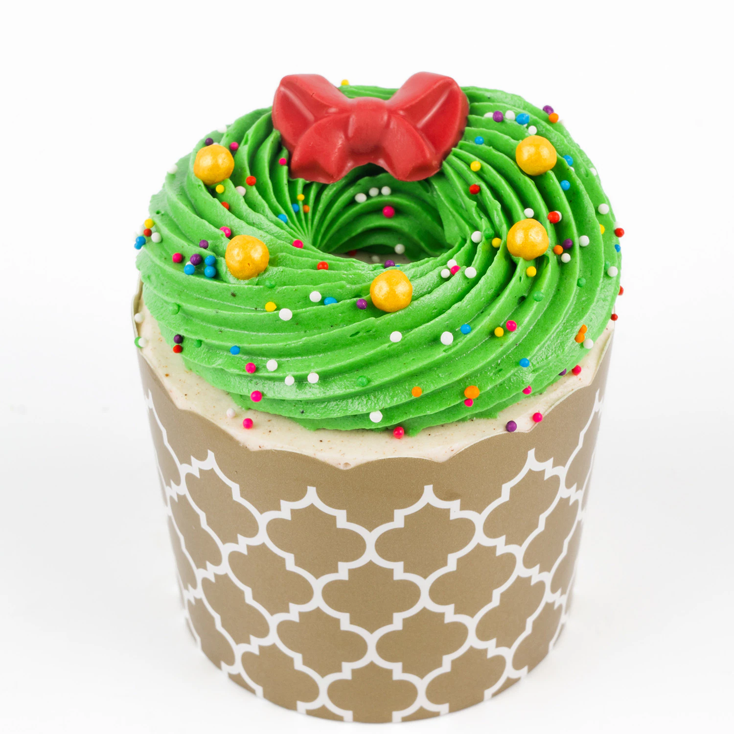 Coquito Custard-filled Vanilla Cupcake topped with Coquito Buttercream, Chocolate Bow, Gold Crispy Pearls, and Rainbow Sprinkles